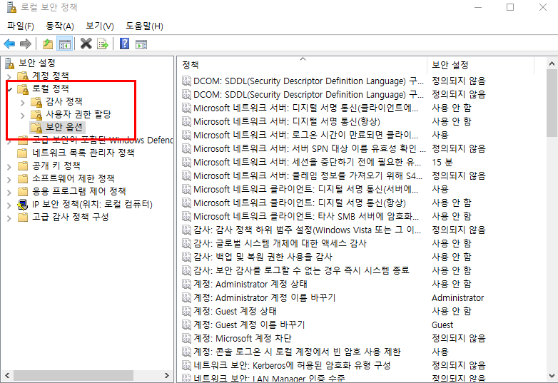 로컬 보안 정책 메뉴를 클릭하여 보안 설정들을 확인해 주세요