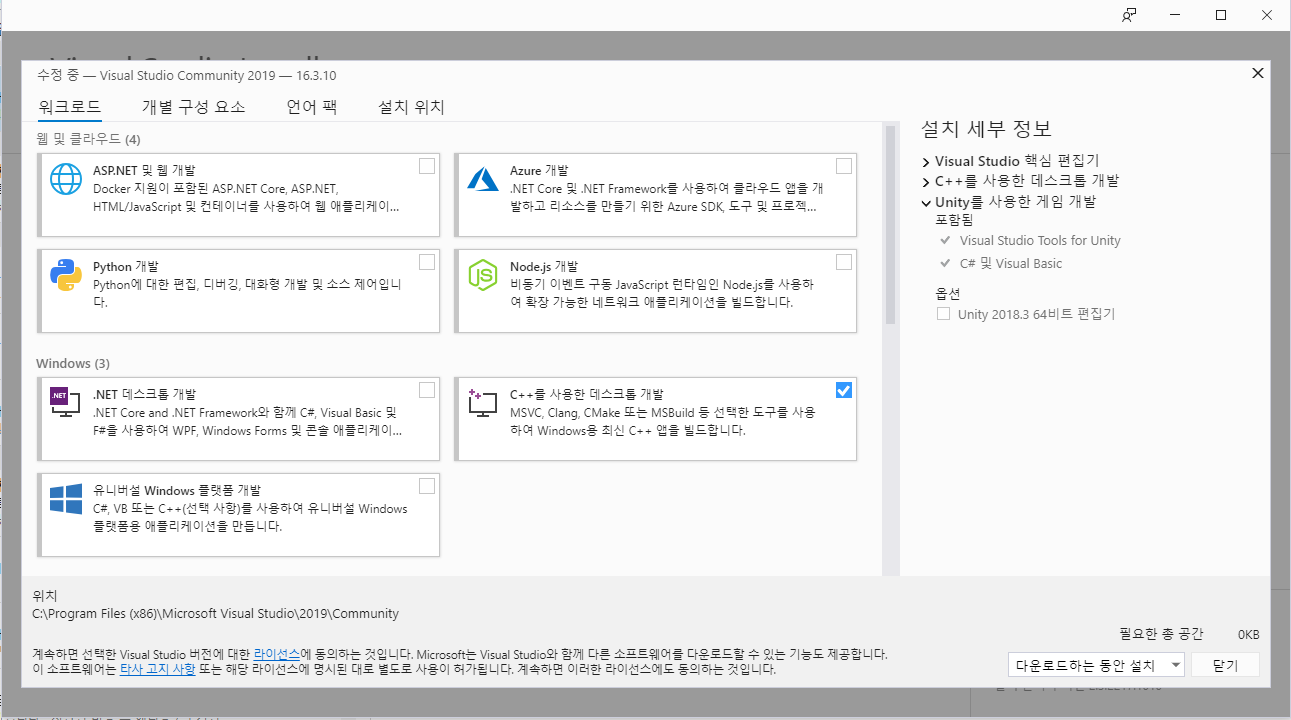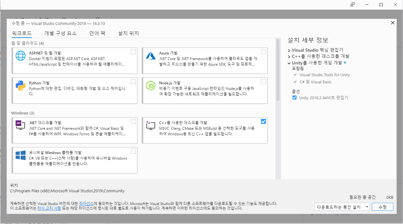 * 오른쪽에서 'Unity를 사용한 게임 개발' 항목을 확장하고 'Unity 20XX 64비트 편집기' 체크