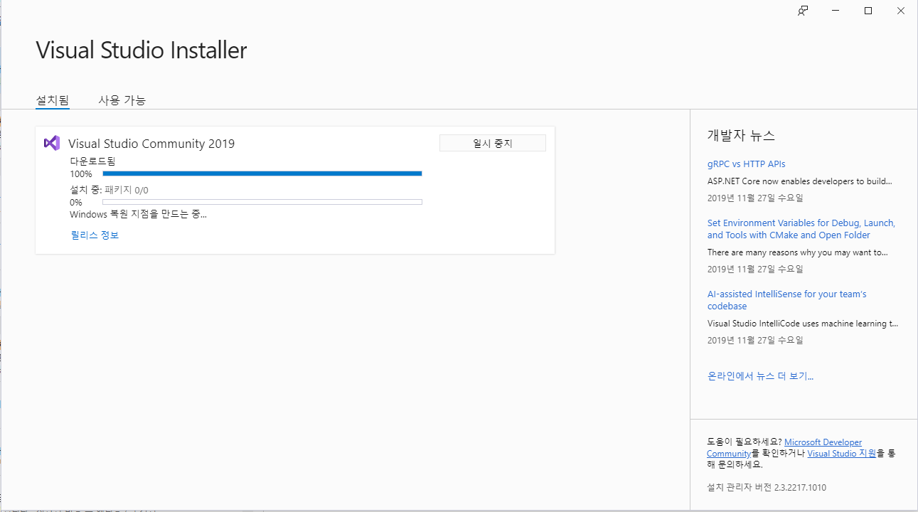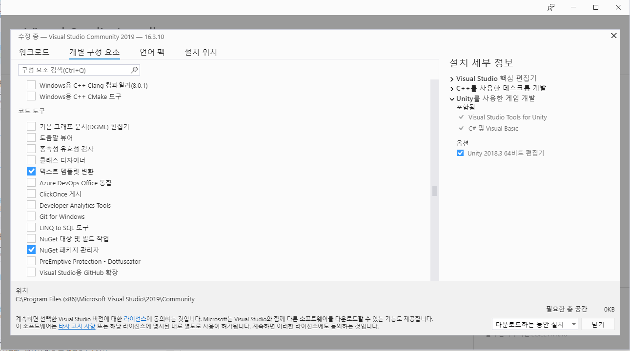 * 혹시 모르니 '개별 구성 요소' 탭 - 코드 도구 - 'NuGet 패키지 관리자' 체크가 안되어있으면 체크