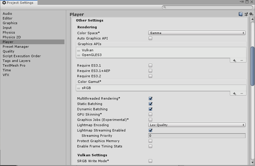 [Player Settings...]를 누르면 [Project Settings] > [Player] 메뉴로 위치한 팝업이 생성됩니다.