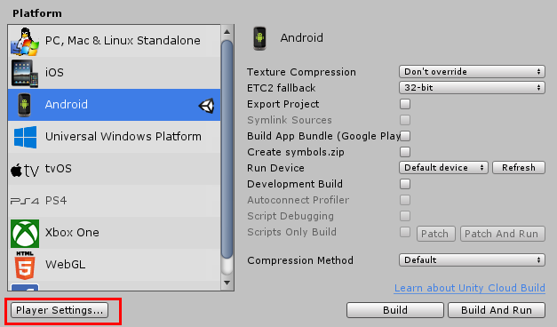 그리고 [Player Settings...] 버튼을 클릭하여 사용사 설정을 변경합니다.