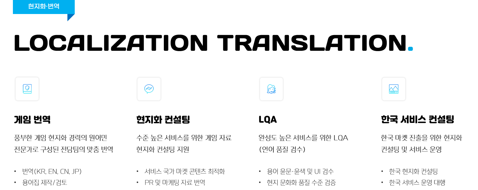 - LQA / UI QA / 시스템 메시지 등 메인 번역 / 용어집 전달 / 영어,간체,번체,일어 등