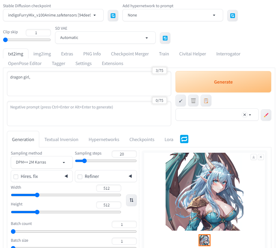 dragon girl 이라는 프롬프트로 다른건 안건드리고 바로 생성해 보았습니다.
