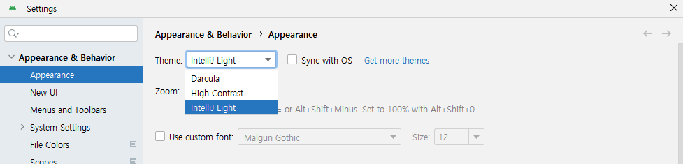 테마 종류는 기본으로 3종이 제공됩니다.(IntelliJ Light, Higth Contrast, Darcula)
