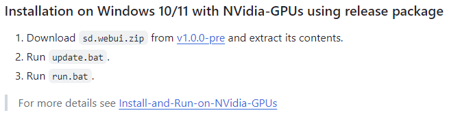 The webui.zip is a binary distribution for people who can't install python and git. Everything is included - just double click run.bat to launch. No requirements apart from Windows 10. NVIDIA only....
