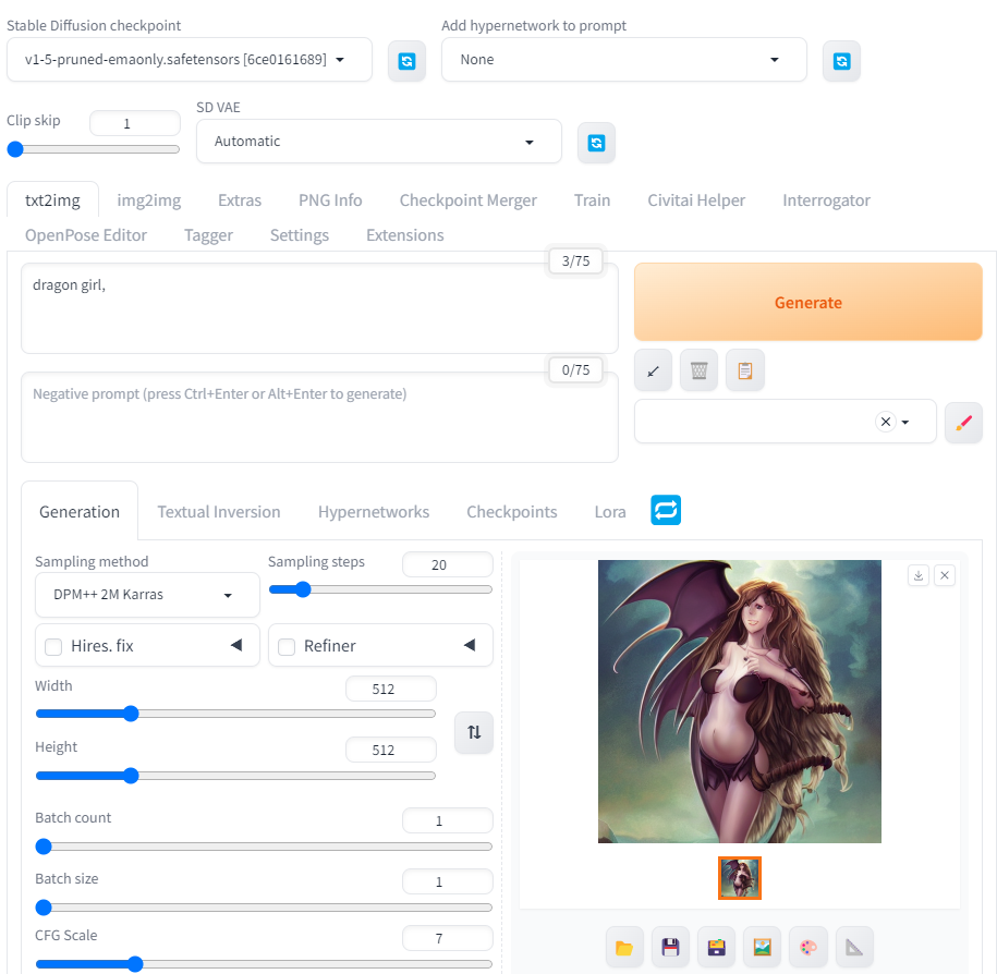 dragon girl 이라는 프롬프트로 다른건 안건드리고 바로 생성해 보았습니다.
